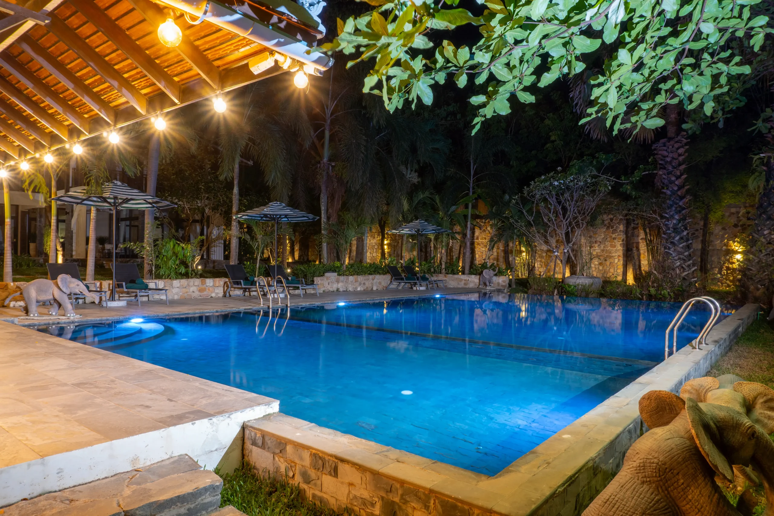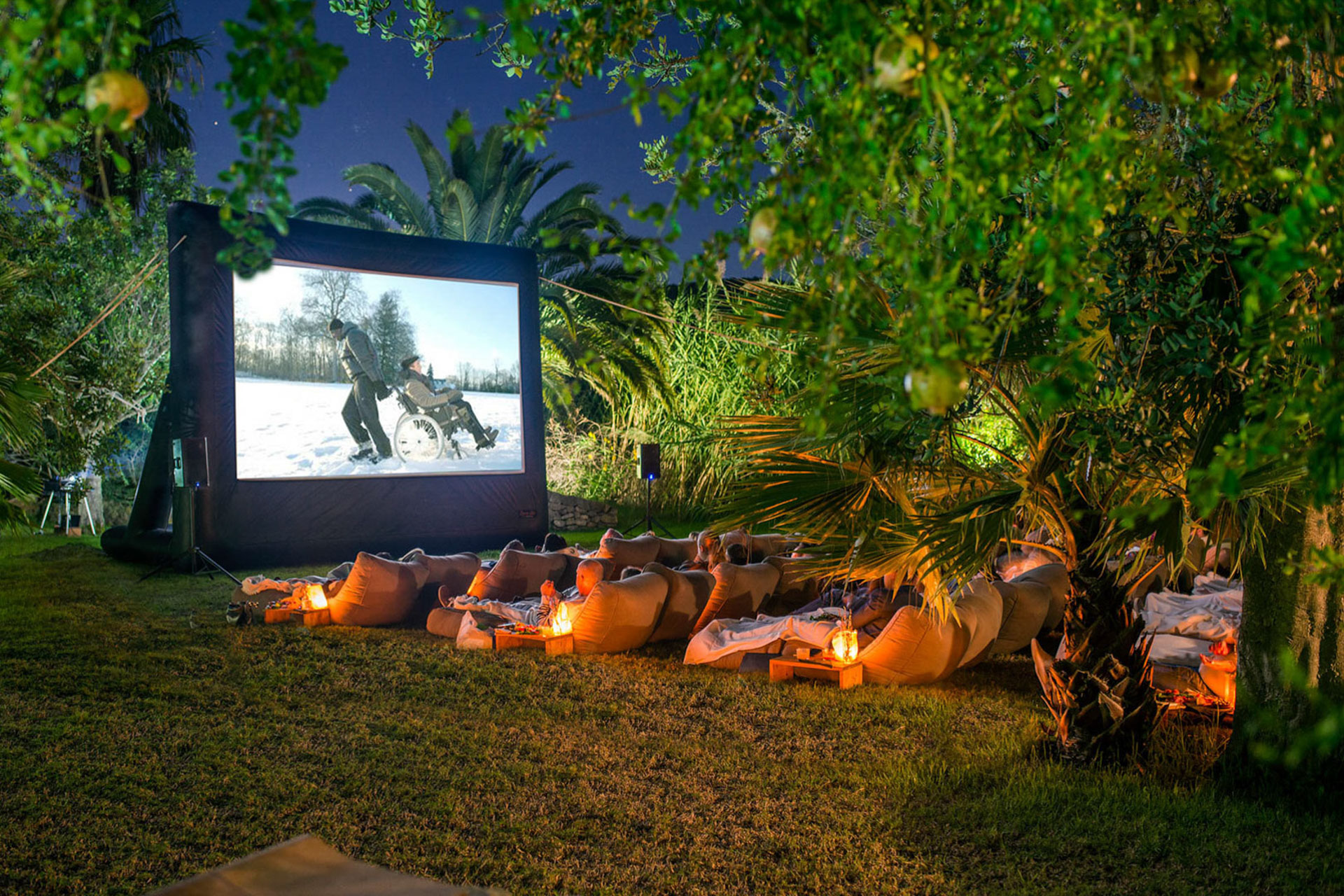 An open-air movie night by the pool, where warm evenings, soft lighting, and curated sound create an intimate private cinema experience beneath the Kep sky.