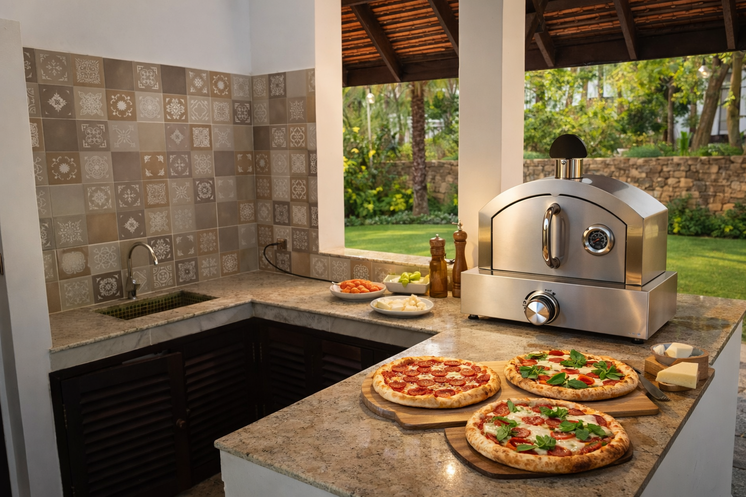 Gather around the outdoor kitchen for relaxed pizza and barbecue nights—cook together or invite a private chef for a lively, shared culinary experience.